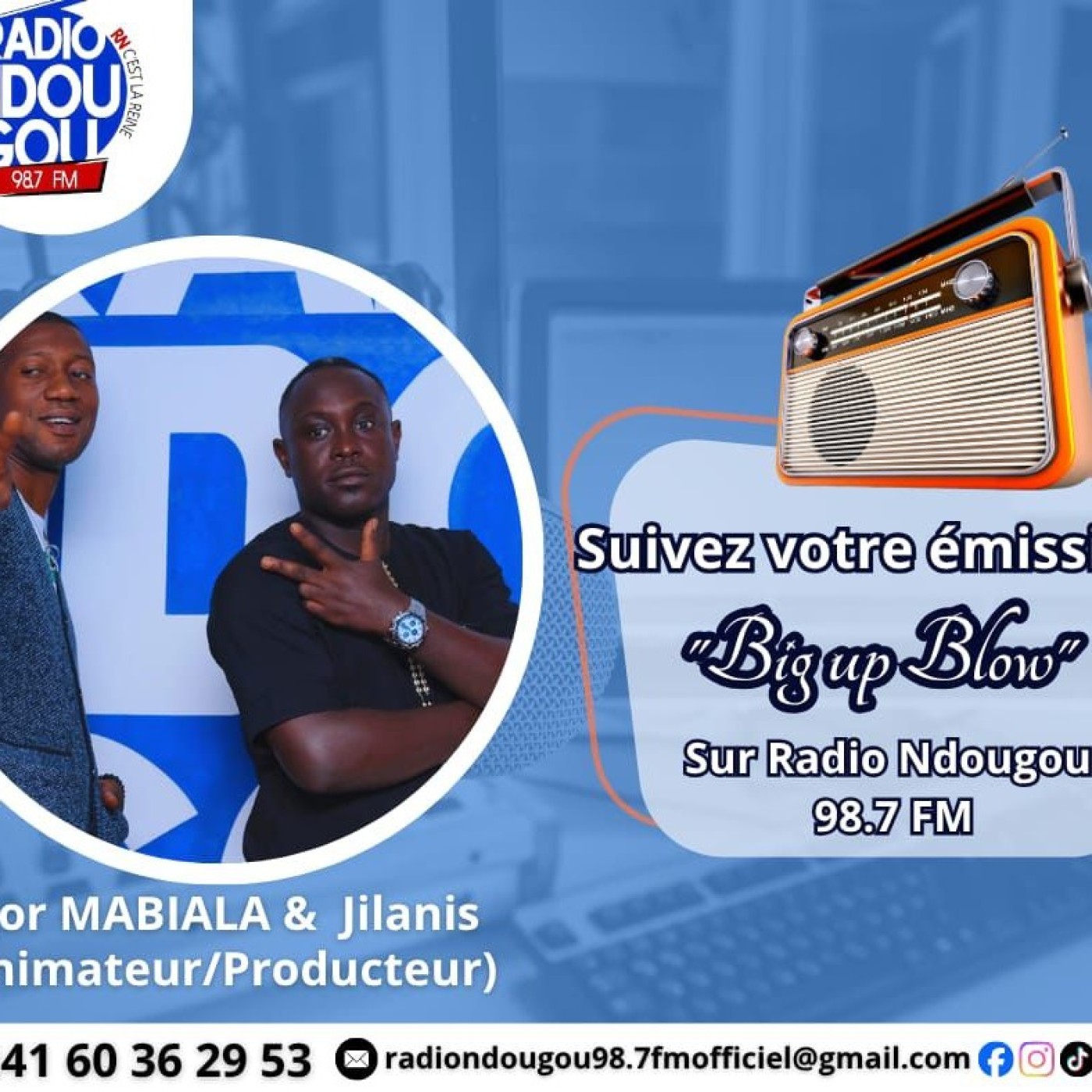 « Big Up Blow » est une émission jeune, rythmée et urbaine, pensée pour les amoureux de musique, de culture et de vibes positives. Diffusée sur la station Radio Ndougou, elle met en avant les talents émergents, les tendances musicales et l’univers vibrant de la jeunesse.